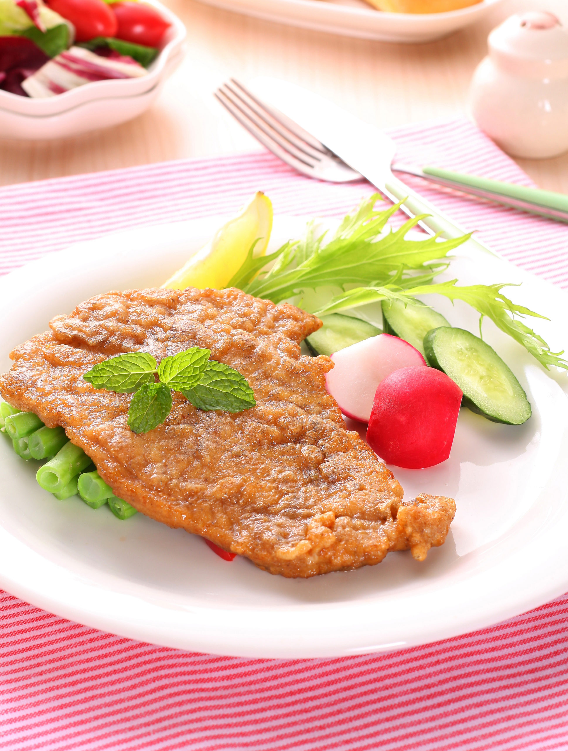 待產品解凍後,直接放入約170℃~180℃的熱油中,約1~2分鐘,炸或煎至兩面表皮呈金黃色即為香酥可口的豬排。(烹調後請於當日食用完畢)
